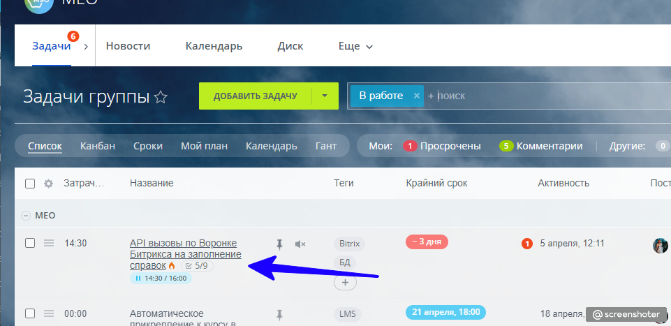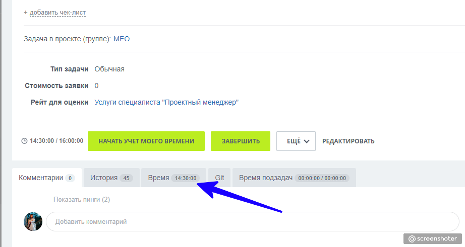 - Если вы еще не приступили к выполнению задачи и хотите, чтобы Битрикс сам посчитал время, то нажимаете «Начать учет моего времени», а по окончанию задачи останавливаете таймер.