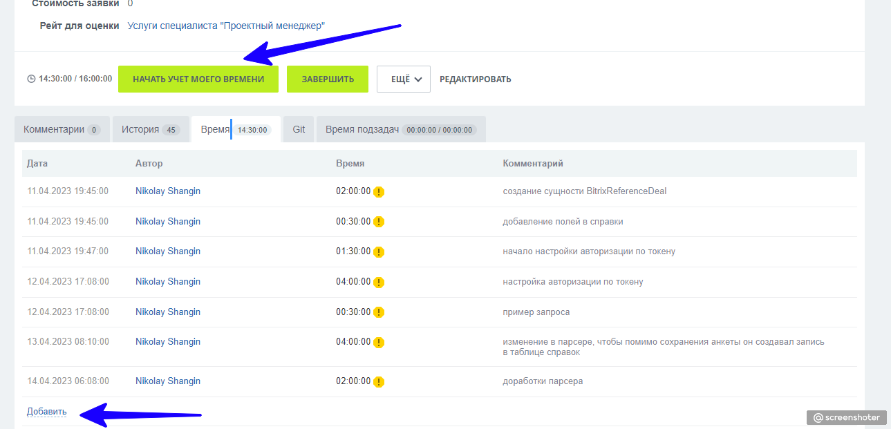 - Если вы уже выполнили задачу, то нажимаете «Добавить» и указываете день и время, которое вы потратили. Также необходимо добавить описание того, что вы делали по данной задаче